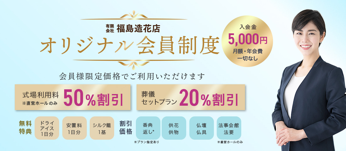 本会は「有限会社 福島造花店」(以下、「福島造花店」又は「事務局」という。)が施行する葬儀葬祭をはじめと し、会員の将来への安心と生活に密着したサービス等の「会員特典」のご提供を目的といたします。